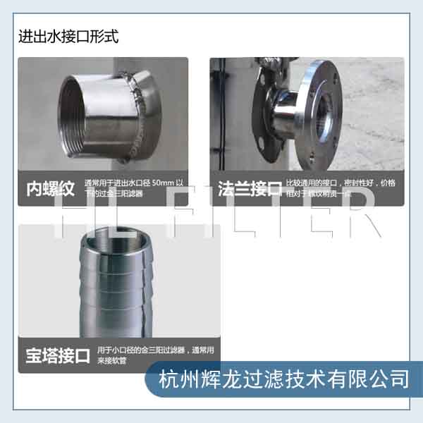 过滤器的连接主要由接头形式决定。目前主要的连接方式有:法兰连接、快装、螺纹、宝塔皮管连接等