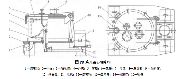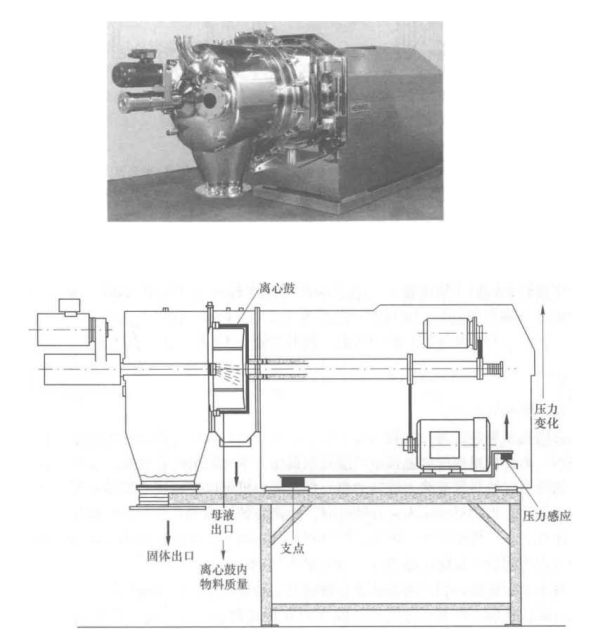 上悬式离心机是转鼓主轴上端悬挂在支架横梁上的一种过滤离心机,其卸料方式又分 为重力卸料和机械刮刀卸料两种,均为下部卸料.