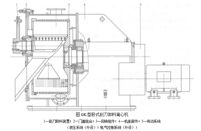 GK型卧式刮刀卸料离心机主要由刮刀机构,门盖组件,转鼓组件,机座组件,传动系统,液压系统及电气控制系统等部件组成.